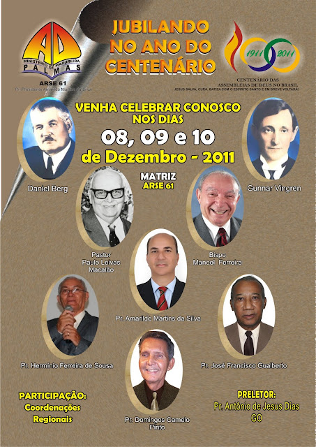 A Assembleia de Deus Madureira de Palmas, presidida pelo pastor Amarildo Martins, irá realizar nos dias 08 a 10 de dezembro na igreja Matriz em Palmas, o culto em celebração pelo Centenário das Assembleias de Deus no Brasil com a participação de todo o campo.